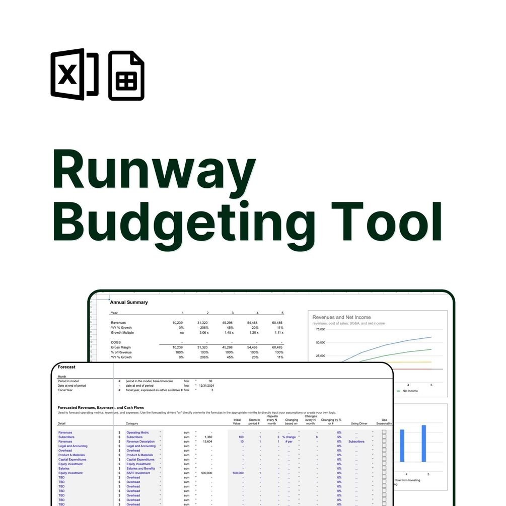 The Runway Budgeting Tool is a three year spreadsheet financial model template to plan your expenses, create a cash budget and forecast runway. Prebuilt consolidated three statement model - income statement, balance sheet, and statement of cash flows - and key charts and summaries. No locked cells, no macros, edit anything. One-time purchase, lifetime access. Select the Model only or add on the Custom Revenue Model option for 2 hours of personal support in building a custom revenue model for your business.