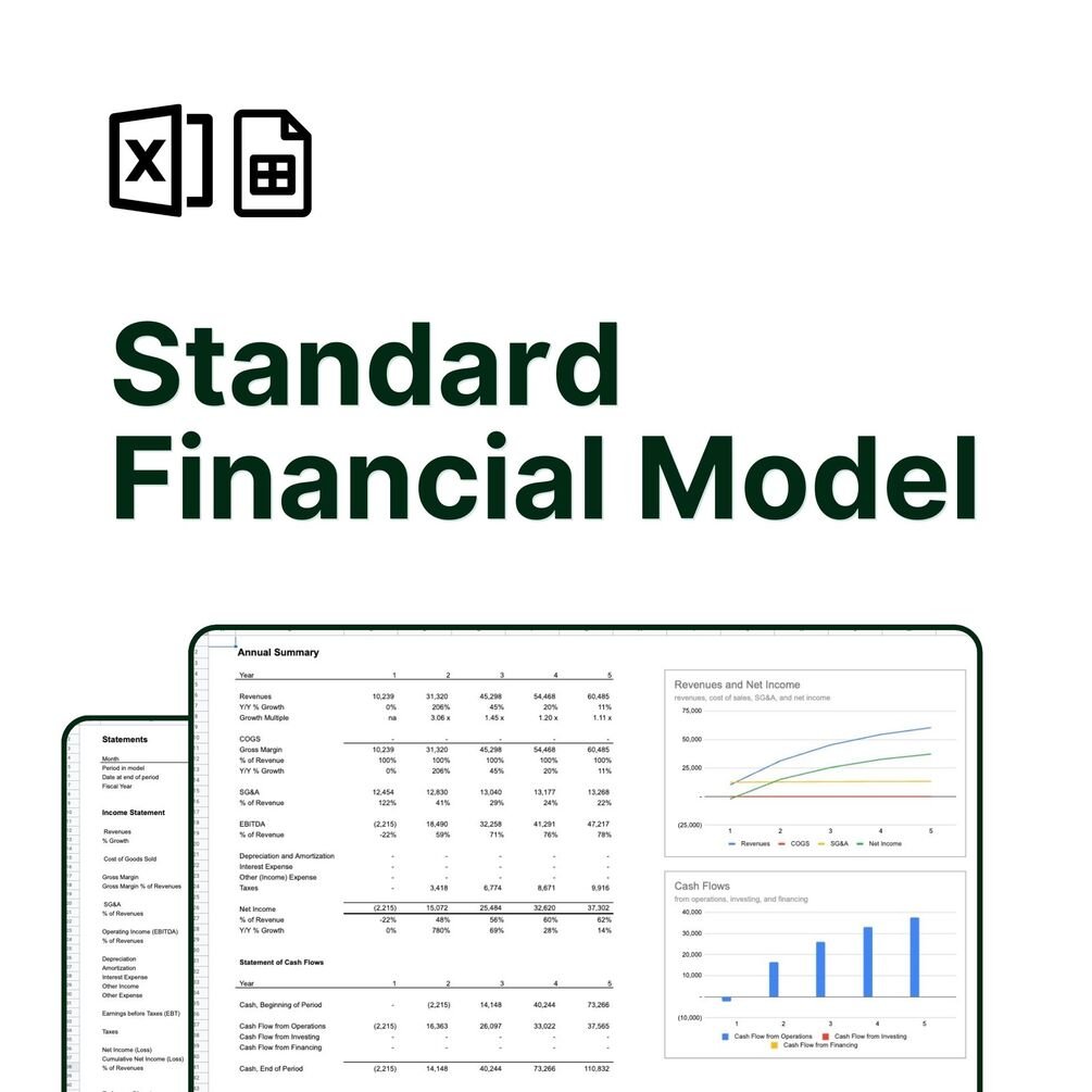 The Standard Financial Model is a five year spreadsheet financial model template for Excel or Google Sheets with an extensive prebuilt revenue model and a flexible, driver-based system for forecasting expenses aggregating into a consolidated three statement model, outputting income statement, balance sheet, and statement of cash flows with key charts, summaries, key metrics, and funding forecasts. Used by over 4,000 founders worldwide since 2015. No locked cells, no macros, edit anything. One-time purchase, lifetime access. Select the Model only or add on the Custom Revenue Model option for 2 hours of personal support in building a custom revenue model for your business.